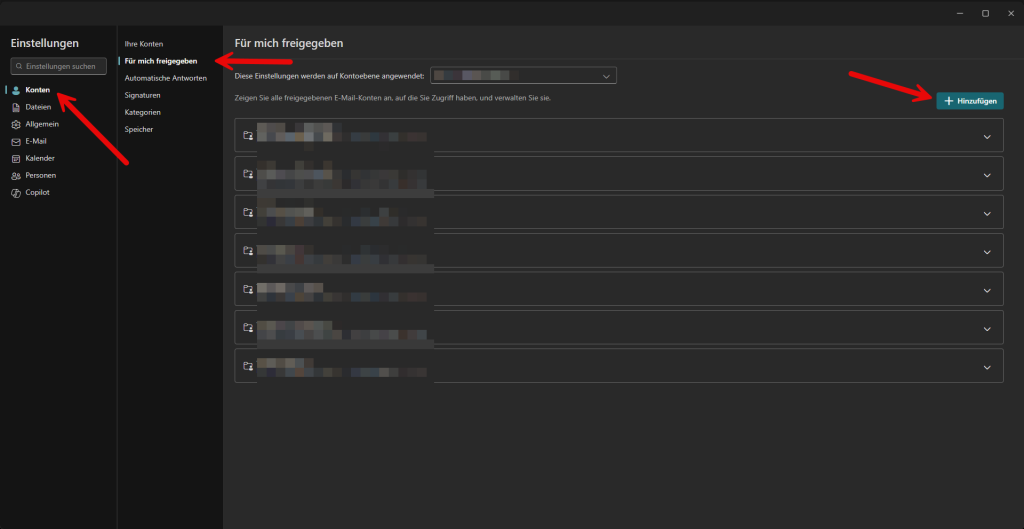 Datei → Kontoeinstellungen → Konten → Für mich freigegeben → Hinzufügen. Gib die E-Mail ein und bestätige.